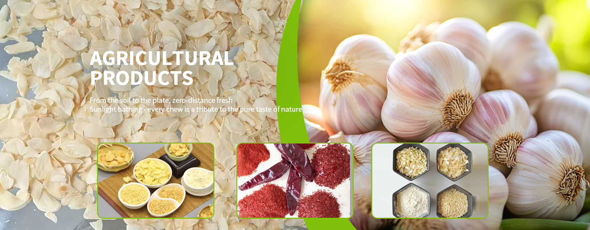 Our featured products include garlic flake, garlic powder, garlic granule, horseradish slice, ginger slice, minced carrot, different kinds of onion ring, onion minced, granulated, powder, and dried cauliflower.